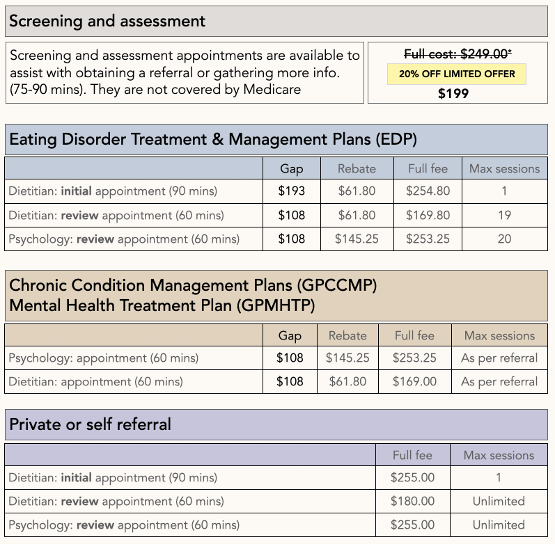 Rebates are available for all referrals covered by an Eating Disorder Treatment & Management Plan, a GP Chronic Condition Management Plan (GPCCMP) or a GP Mental Health Treatment Plan (GPMHT); with clients responsible for meeting the gap payments as required.